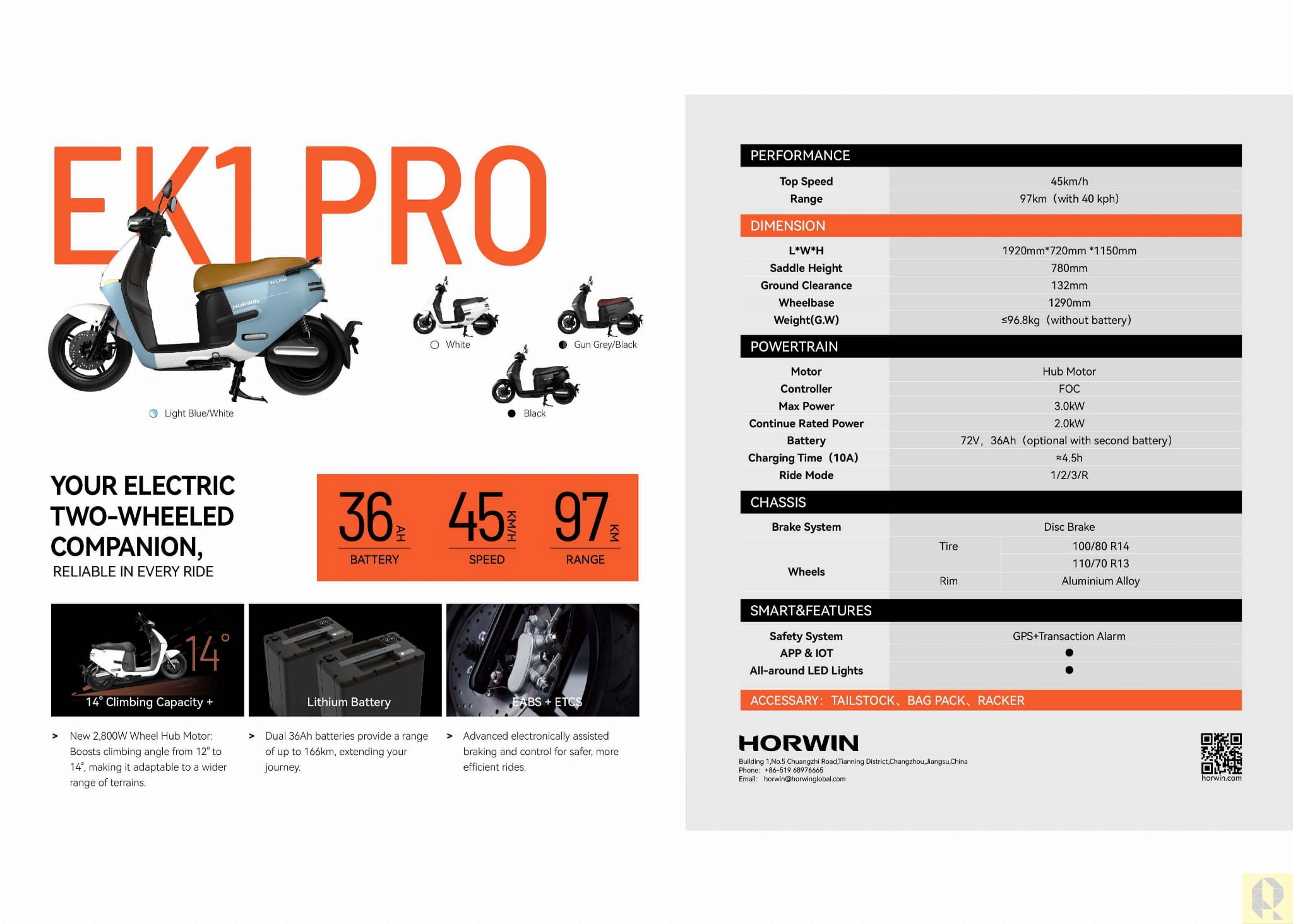 Horwin EK1 PRO to niezawodny, elektryczny towarzysz codziennych podróży, zaprojektowany z myślą o maksymalnej wydajności w ruchu miejskim. Ten stylowy skuter oferuje prędkość maksymalną 45 km/h oraz zasięg wynoszący 97 km na jednej baterii (przy prędkości 40 km/h). Wyposażony w silnik w piaście o mocy szczytowej 3,0 kW oraz zaawansowane systemy bezpieczeństwa EABS i ETCS, EK1 PRO gwarantuje płynną i bezpieczną jazdę przy zachowaniu niskich kosztów eksploatacji.