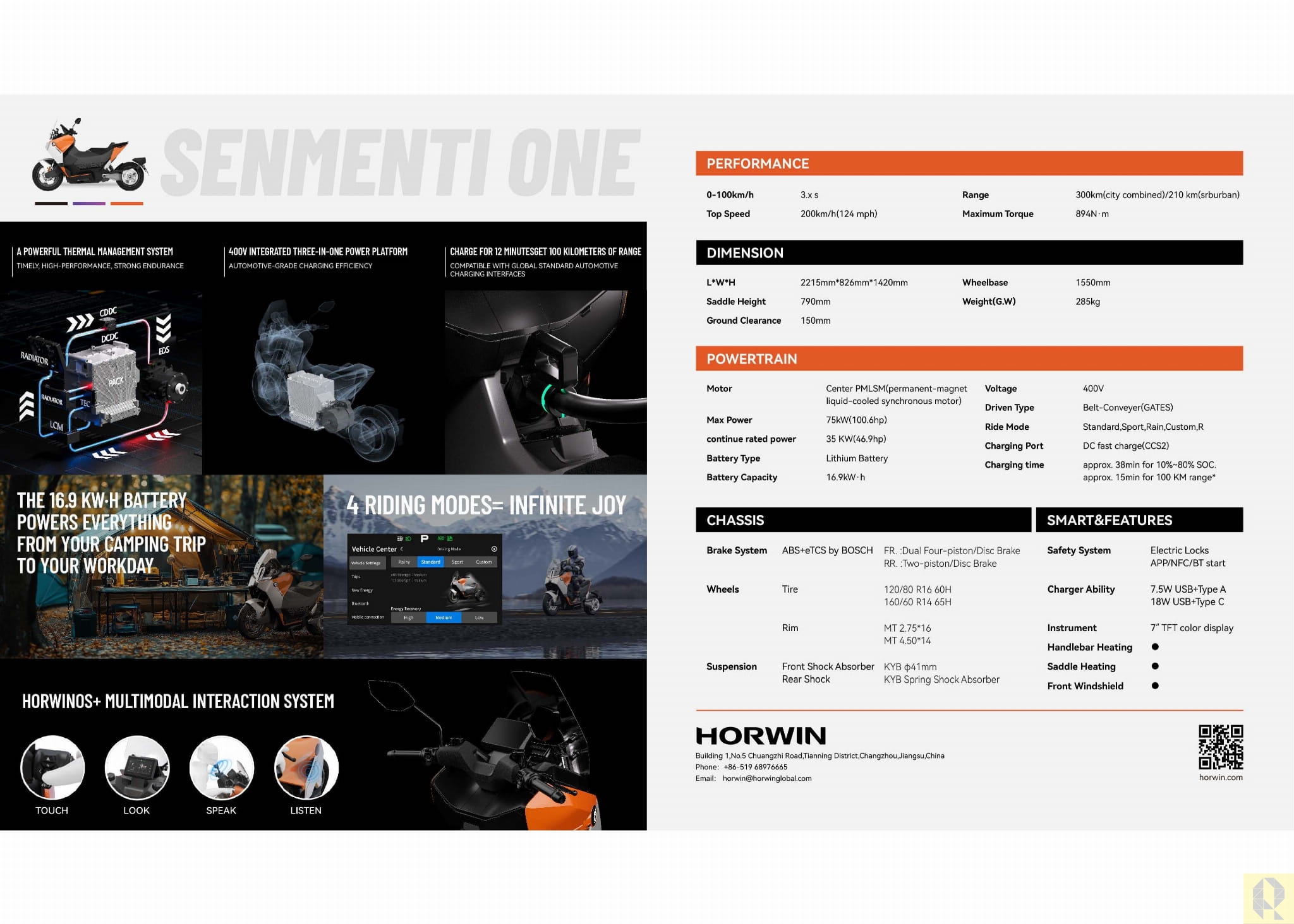 Horwin Senmenti One to szczytowe osiągnięcie w dziedzinie wysokowydajnych motocykli elektrycznych, łączące osiągi supersportowe z komfortem nowoczesnego maxiskutera. Pojazd oferuje ekstremalne przyspieszenie od 0 do 100 km/h w czasie zaledwie 2,8 sekundy oraz prędkość maksymalną wynoszącą 200 km/h. Dzięki potężnej baterii o pojemności 16,9 kWh oraz systemowi szybkiego ładowania 400V, Senmenti One zapewnia zasięg do 300 km w cyklu miejskim, wyznaczając nowe standardy w segmencie Electric High-Performance.